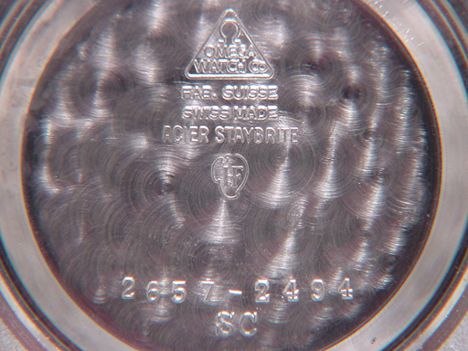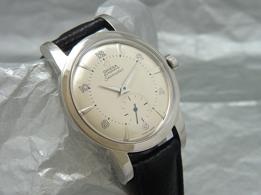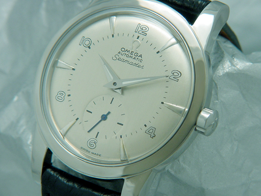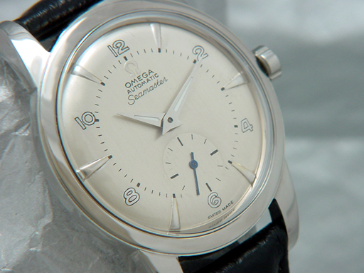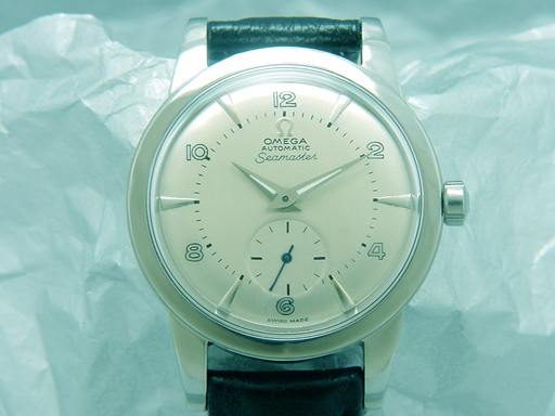 Beautiful Large, 1st Generation Omega Seamaster in all stainless. Nice 2-Tone Silver dial has been professionally restored. Accenting the arrow point markers and arabic style numerals are dauphine style, luminous hands and a blued sub-seconds hand. The screw-back, Stainless Steel case is quite nice with a few signs of use on case back. This nice case measures 36.3 mm in diameter, exclusive of crown, and 46.2 mm in overall length. Case reference number is 2657-2494 SC. The original and robust Omega Caliber 332 populates the case of this Seamaster. It is a large 17 Jewel, Bumper-Wind Automatic that bears serial number 12255079 from the year 1950. This Seamaster has installed a new 18 mm genuine leather band.Signed 4 Times; Dial, Movement, Case Back, and Crown.