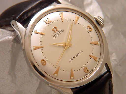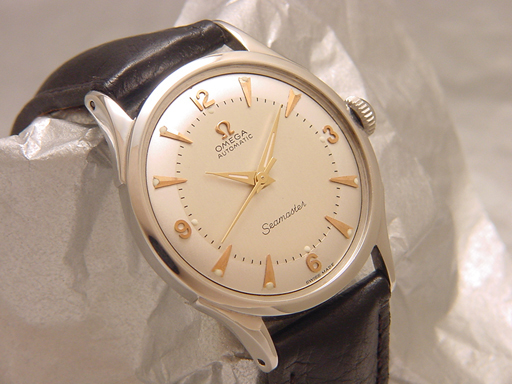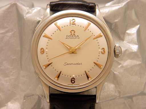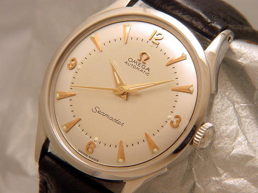 Super nice Omega Seamaster in all stainless steel. Beautiful 2-Tone Silver dial has been professionally restored. Arrow point and Arabic Numeral markers adorn this dial. The all Stainless Steel screw-back case is quite nice with a few signs of use on case back. Case bears reference number 2635-1H. It measures 33 mm in diameter, exclusive of crown, and 40 mm in overall length. The reliable Omega Caliber 351 powers this Seamaster. This original and robust movement is a 17 Jewel, Bumper-wind Automatic that bears serial number 12714437 from the year 1951. This nice Seamaster has 18 mm genuine leather band installed.Signed 4 Times; Dial, Movement, Case Back 2-Times, and Crown.