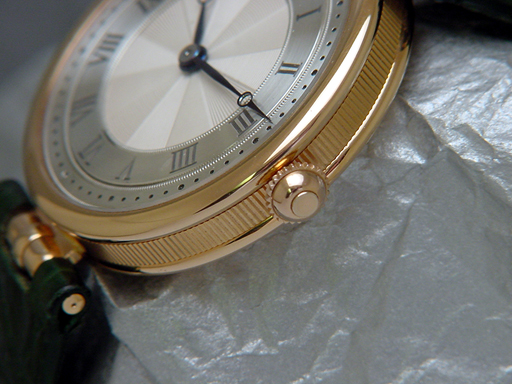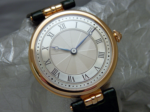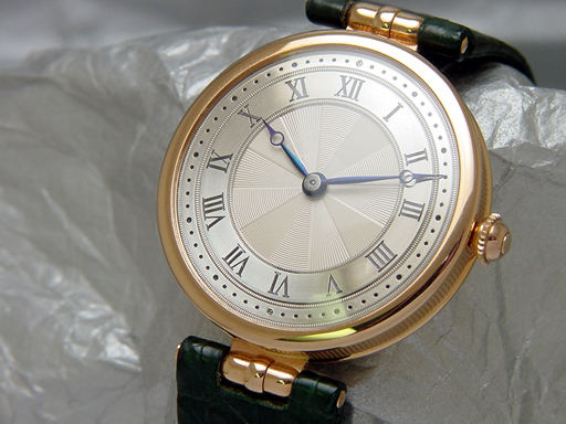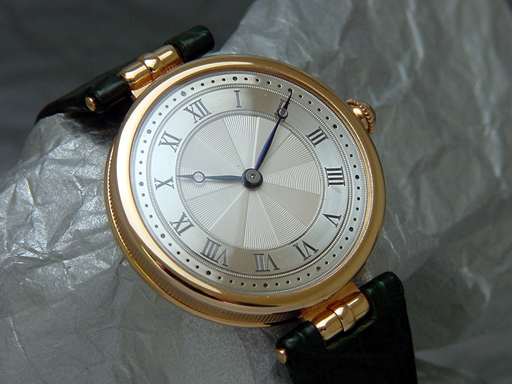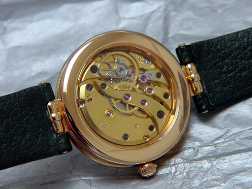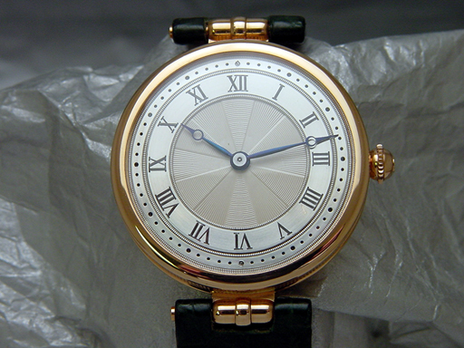 Here is a magnificent, custom 18K cased Patek. This wristwatch was made by well noted Tourbillon maker Gene Clark. Many people consider Gene to have been the finest American watchmaker ever. It so happens that Gene started out making this watch for himself, and was convinced to sell it to one of his most valued customers when it was finished. The Fine Silver dial is totally hand made by Mr. Clark himself, along with the blued steel hands. Gene also made the custom, coin-edge, 18K Rose Gold case from scratch, and it is absolutely gorgeous! Case measurements are 31.2 mm in diameter, exclusive of the custom crown, and 38.2 mm in overall length. The see through back shows off the detail of the premier, hand-wind Patek movement. Housed in the beautiful case is a Patek Caliber 10-200 which was completely reworked and finely tuned by Clark himself. It is 24K gold plate over a delicate matte finish with highly polished, heat blued screws and black, (mirror), polished steel components. Fitted to this beauty is a genuine Patek strap with custom made 18K Rose Gold buckle also made by Clark. This watch has never been worn since Clark finished it. There is only one like this on the planet!Price (Sold)