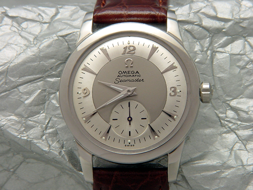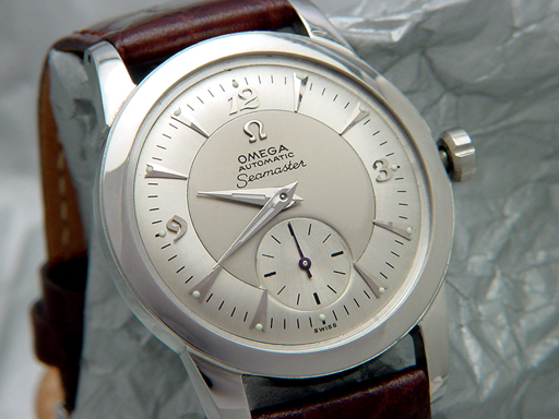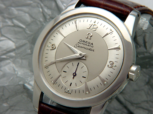 Spectacular Omega Seamaster with Beefy Lugs cased in Stainless Steel. The 2-Tone, gray and silver dial is an eye catcher! It has been professionally restored and its pointed silvered markers are accented by new hour and minute hands. Beefy Lug, all Stainless Steel, screw back case is super nice. It measures 34.3 mm in diameter, exclusive of crown, and 42.6 mm in length. Case reference number is C2576-2. This Bumper Wind Seamaster is powered by its original and robust 17 jewel, Caliber 342, Automatic movement which bears serial number 13004270 from 1952. This nice Seamaster is equipped with a new crystal, new signed crown, new mainspring, new hour/minute hands, new gasket, and new 18 mm genuine leather strap.