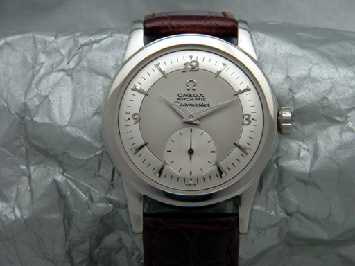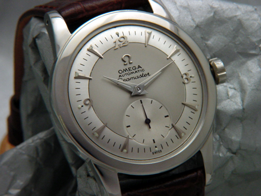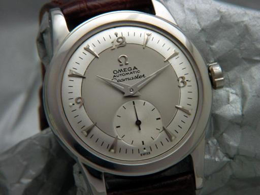 A magnificent, full size Vintage Omega Seamaster Bumper-Wind. Professionally restored 2-Tone with smoke gray center and silver pearl outer is gorgeous. Pointed silver colored markers are accented by new dauphine luminous hands. Subseconds had is bright blued finish. The all stainless steel case is super! It measures 34 mm in diameter, exclusive of crown, by 42 mm in length and bears reference number 2576-12. This Seamaster is powered by its robust and original 17 Jewel, Caliber 342, Automatic Bumper-Wind movement which bears serial number 12063306 from 1950. This super nice watch has a new set of dauphine hands, new crystal, new gasket, and new 18 mm leather strap.