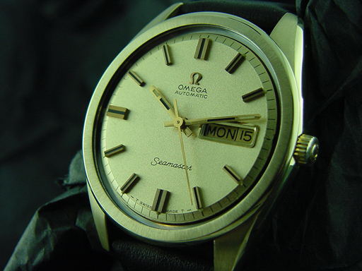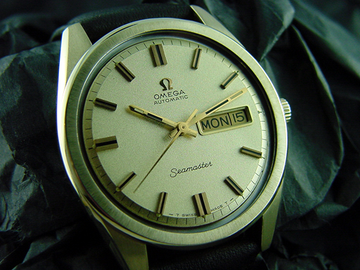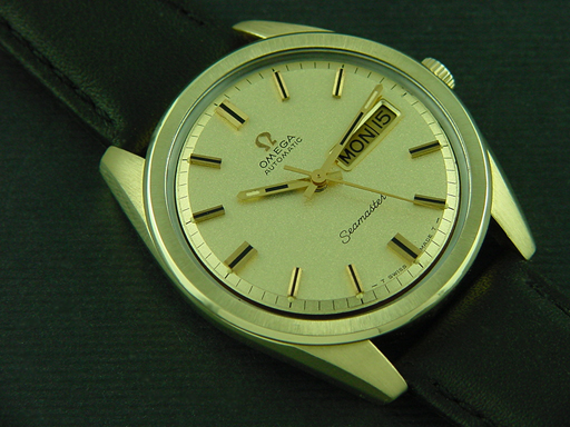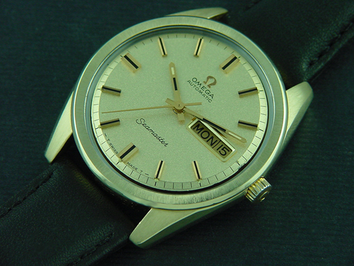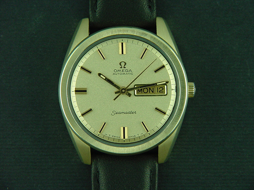 This is a fine example of the one of the last Seamaster movment calibers ever built. The matt finish, day-date, gold tone dial is totally original and in near new condition. This watch has obviously been well maintained over the years, as there are no signs of moisture having ever entered the case. 14K Yellow Gold Fill over stainless steel case measures 36.5 mm in diameter, exclusive of crown, and 41.8 mm in length. This is a large Seamaster! Screw back case reference numbers are 166.032 and 168.023. The original 17 Jewel, Caliber 750, Quick-set Date, Autowind movement is super and bears serial number 29080786 which dates it to 1970. This Seamaster is signed 5 times; dial, movement, case back twice, and crown. It is fitted with a new crystal, gasket, and genuine leather strap.