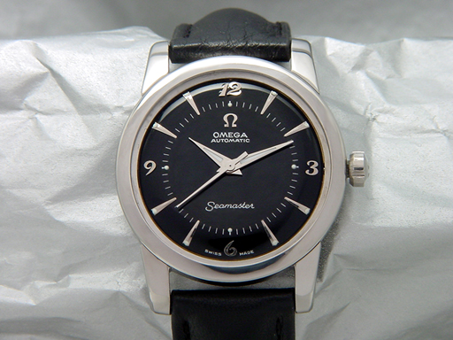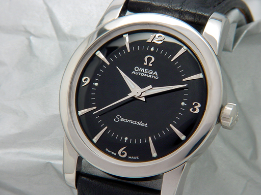 Sharp, Vintage black dialed Omega Seamaster cased in all Stainless Steel. Gloss black dial has been professionally restored. Its pointed and silvered markders are accented by new dauphine style, luminous hands. Very nice three piece Stainless Steel case with Beefy Lugs measures 34.5 mm in diameter, exclusive of crown, and 42 mm in length. It bears case reference number C2577-6SC. Power for this Seamaster is from its original and robust 17 Jewel, Caliber 354, Bumper-Wind, Automatic movement. Serial number is 13770448 from 1953. This great reliable movement is equipped with the Swan Neck micro-regulator for precise adjustment. This super nice watch has a new crystal, new hands, new signed crown, new gasket, and new 18 mm padded leather strap.