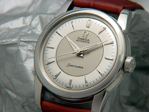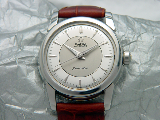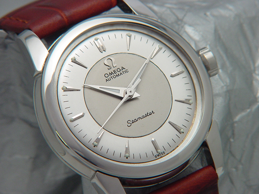 Beautiful Omega Seamaster Mid-Size cased in Stainless Steel. The spectacular 2-Tone, Gray and Silver Pearl dial has been professionally restored. It is accented by new, luminous dauphine style hands. Three piece Stainless Steel case is in super nice condition with only a few tiny signs of use. It measures 32 mm in diameter, exclusive of crown, and 38.2 mm in length and bears reference number 2828-7SC. This Seamaster is powered by its original and robust 17 Jewel, Caliber 470, Automatic movement which bears serial number 15892499 from 1957. This beauty is fitted with a new crystal, new luminous hands, new gasket, new signed crown, new mainspring, and new 17 mm genuine leather strap.