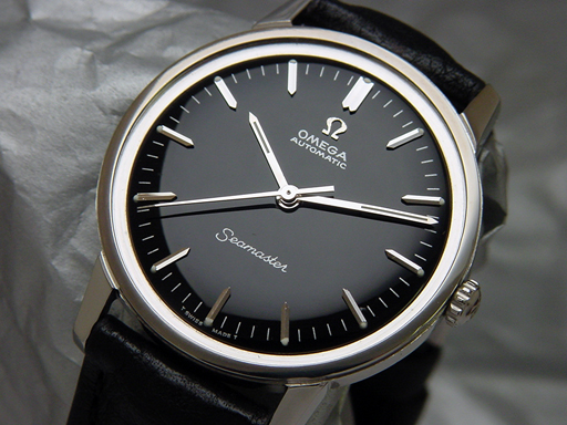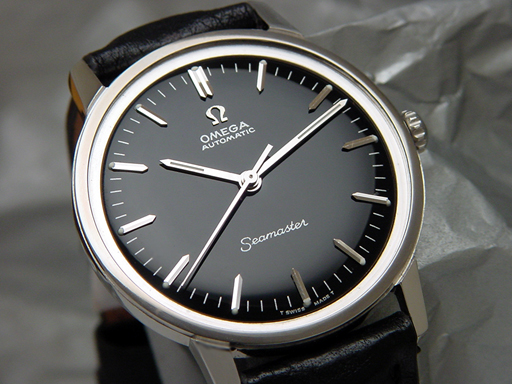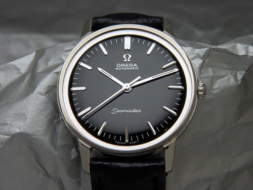 Super, black dialed Omega Seamaster cased in all Stainless Steel. The professionally restored, gloss black dial is accented with new, luminous hands. Very nice, Stainless screw back case has bold lugs and is in very nice condition. It measures 34.5 mm in diameter, exclusive of crown, and 40.5 mm in length. It bears case reference number 165.002. This Seamaster's power plant is its original and robust 17 Jewel, Caliber 550, Automaic movement which bears serial number 22590171 from 1966. It is equipped with the famous Swan Neck micrometer style regulator for precision adjustment. This nice Seamaster is fitted with new hands, a new crystal, new gasket, and a new 18 mm leather strap.