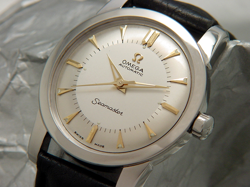 Really nice Omega Seamaster cased in all Stainless Steel. Spectacular 2-Tone Silver dial has been professionally restored and its gold tone markers are accented by new gold tone, dauphine, luminous hands. Three piece, Stainless Steel, screw back case is very nice. It bears reference number C2577-9SC. Measurements are 34.4 mm in diameter, exclusive of crown, and 41.8 mm in length. This Seamaster's engine is its original and robust 17 Jewel, Caliber 354, Bumper-Wind Automatic. It bears serial number 13734129 from 1953 and is equipped with the famous Swan Neck Regulator for precise timing adjustments. This great Seamaster has a new crystal, new hands, new gasket, and new 18mm genuine leather band.