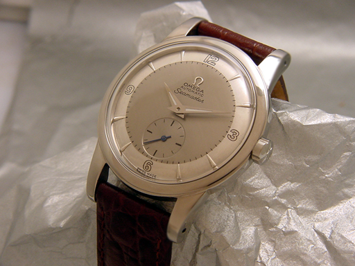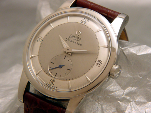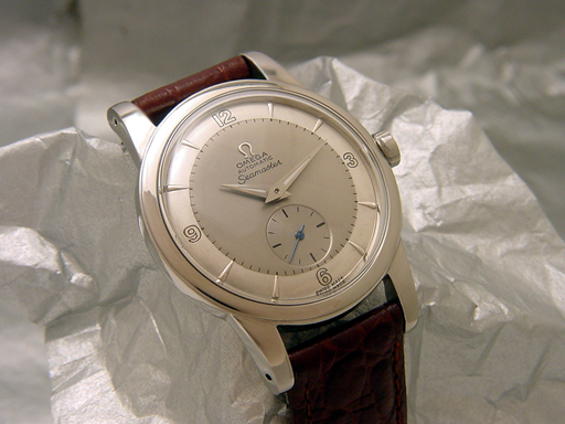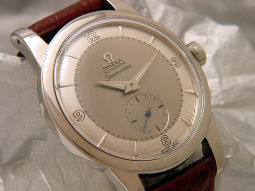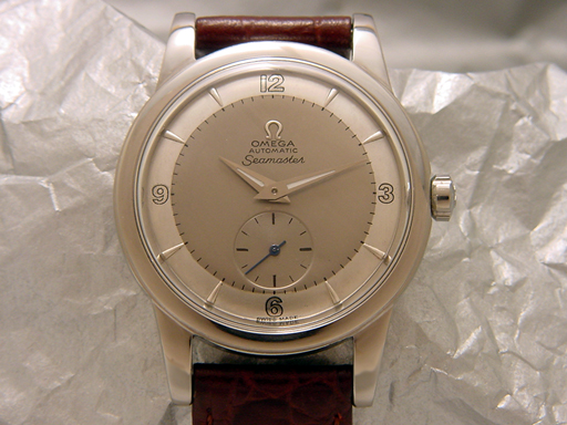 Here is a hard to find large, first generation an Omega Seamaster in all stainless. Beautiful 2-Tone, smoke gray and satin silver dial has been professionally restored. The all 36 mm Stainless Steel, screw back case is quite nice with only a few small signs of use on case. Case reference number is 2493-6. Measurements are 36.2 mm diameter, exclusive of crown, and 46 mm in overall length. The reliable Omega Caliber 332 powers this Seamaster. This original and robust movement is a 17 Jewel, Automatic that bears serial number 12157429 from the year 1950. This Seamaster has installed a new 18 mm genuine leather band.Signed 4 Times; Dial, Movement, Case Back, and Crown.